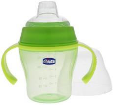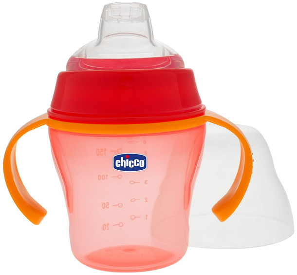 Чашката с мек накрайник на "Chicco" е не разливаща се и специално проектирана за чувствителните венци на бебето. Дръжките са меки, ергономични и удобни за малките детски ръце, позволяват на детето да се обслужва само и лесно да се приучи да пие от чаша, а капачката предотвратява замърсяването ѝ. Тя е практична, удобна и много подходяща за плавно преминаване от бебешки шишета към чаша. Почиства се лесно и може да се мие в съдомиялна машина.